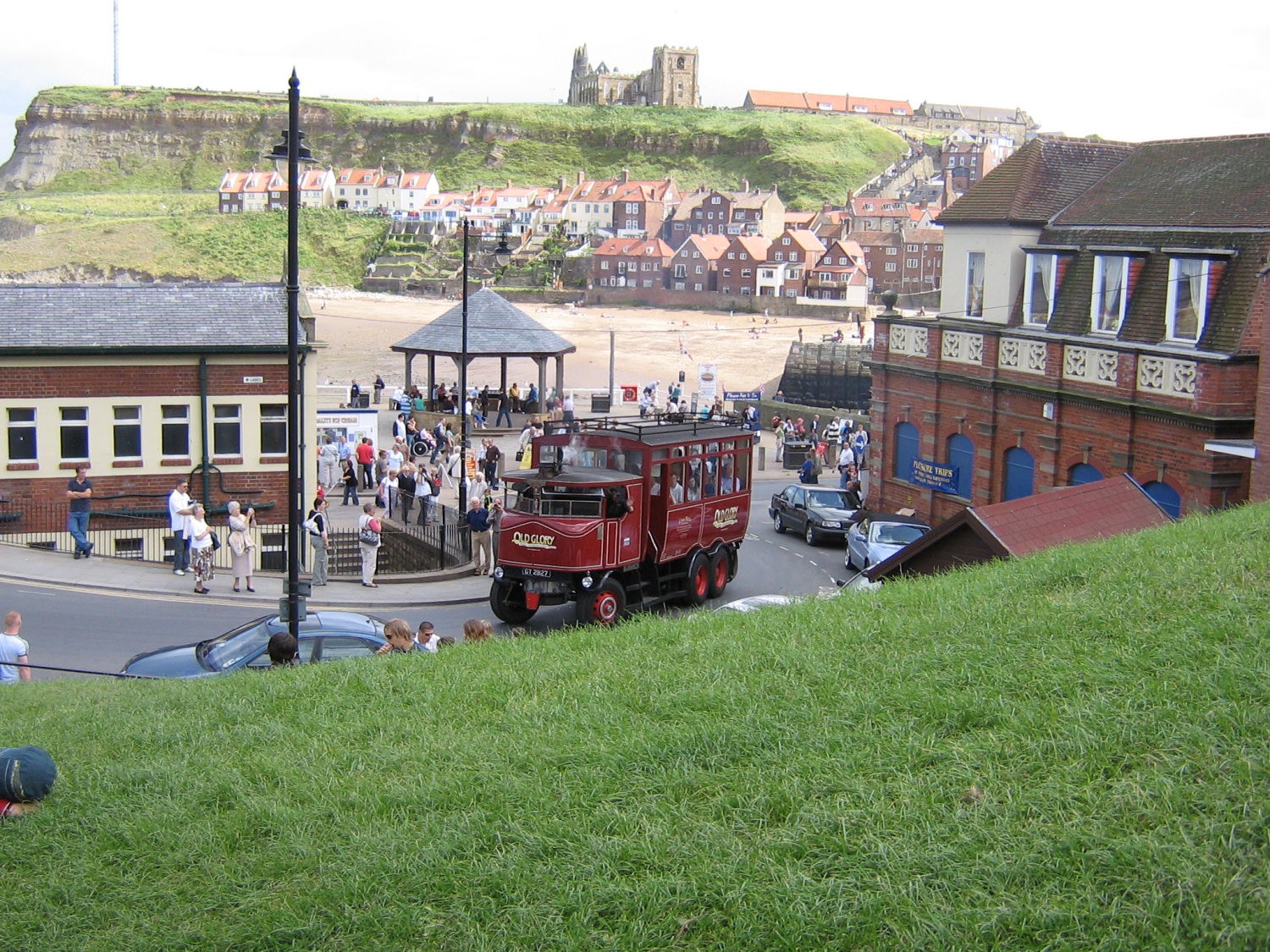 Whitby. The steam bus is a 1931 Sentinel DG6P which was originally a freight truck.  It was preserved in 1962, and converted into a tour bus by Northern Star Motor Carriage Company, specifically for use in Whitby, though has since been sold on and the last I heard, it was in Weston-super-Mare.