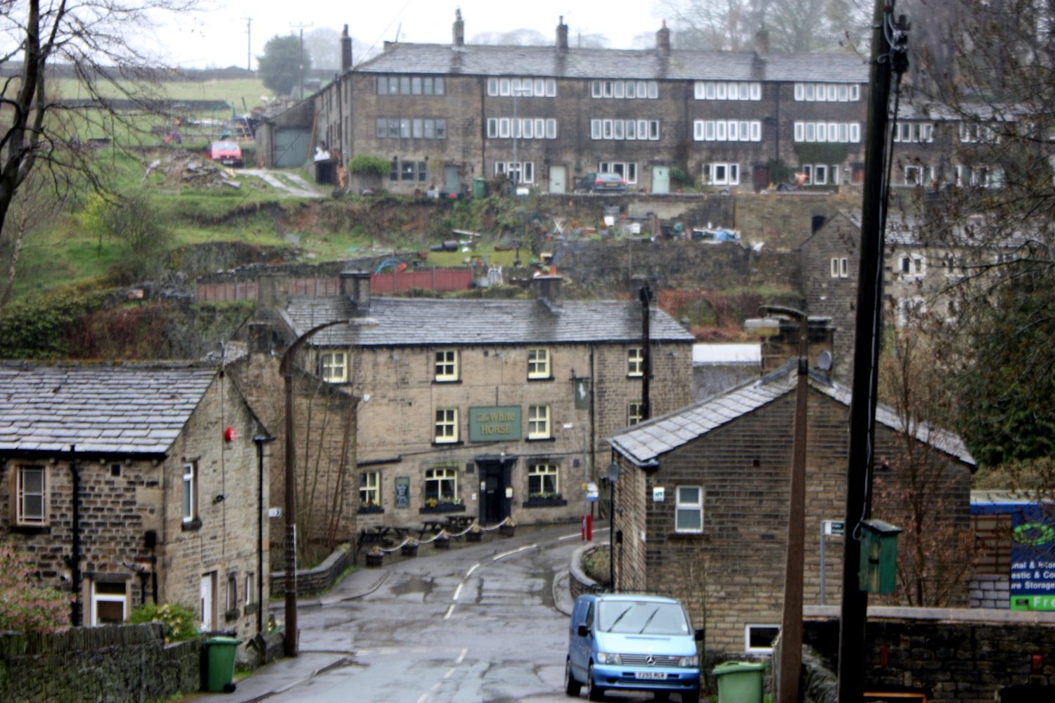 A more general view of the White Horse, with the houses of Norman Clegg and Howard and Pearl above. It never stopped raining from when we woke up to when we went to bed that day!