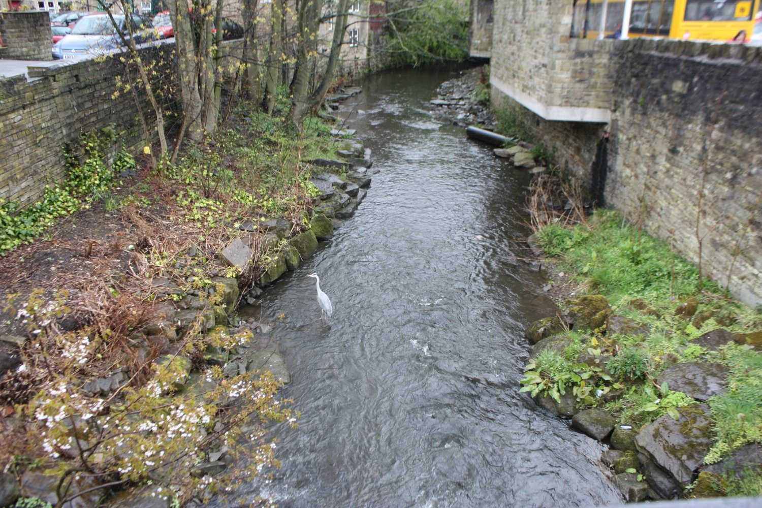 The River Holme, running through the centre of Holmfirth, with a Heron looking for his lunch.