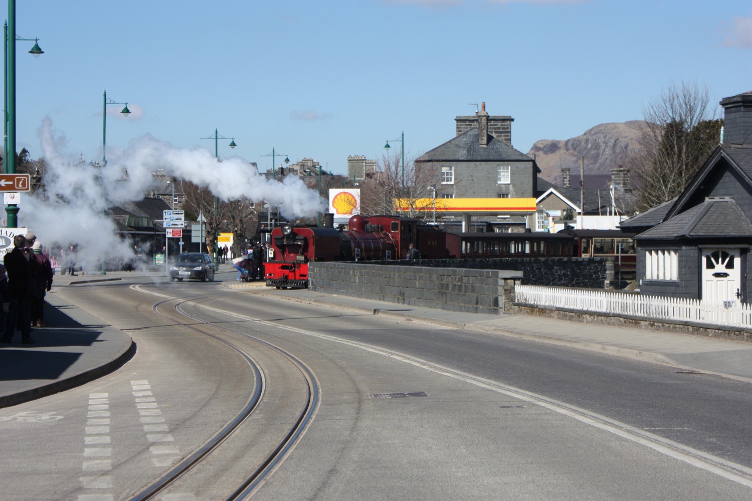 The new level crossing connecting the Welsh Highland Railway to the Ffestiniog Railway at Portmadoc. The train is about to cross the road to enter the Ffestiniog Railway Station.