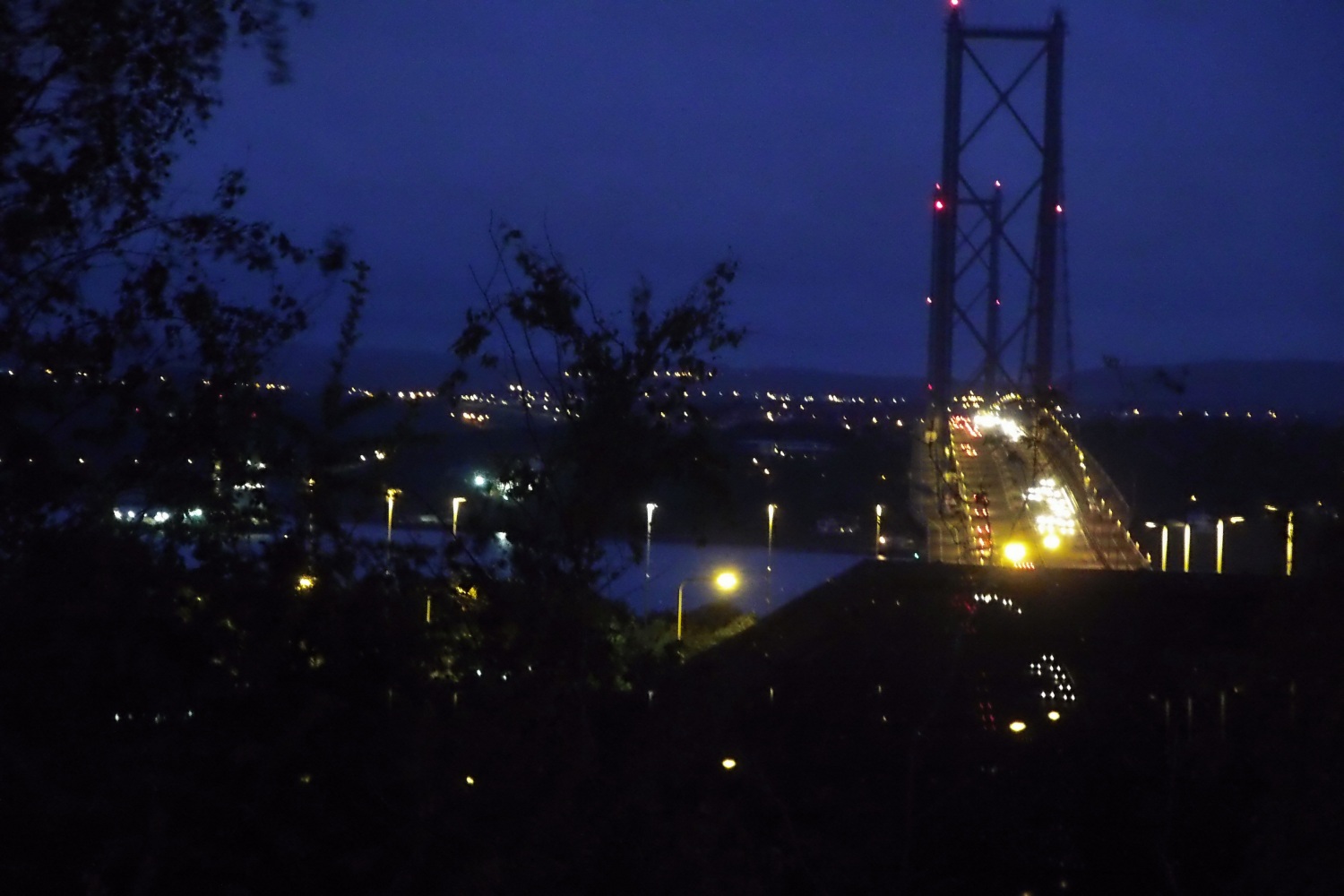 On our way home now, and back at the South Queensferry Premier Inn, with the Forth Road Bridge at night seen from our room.
