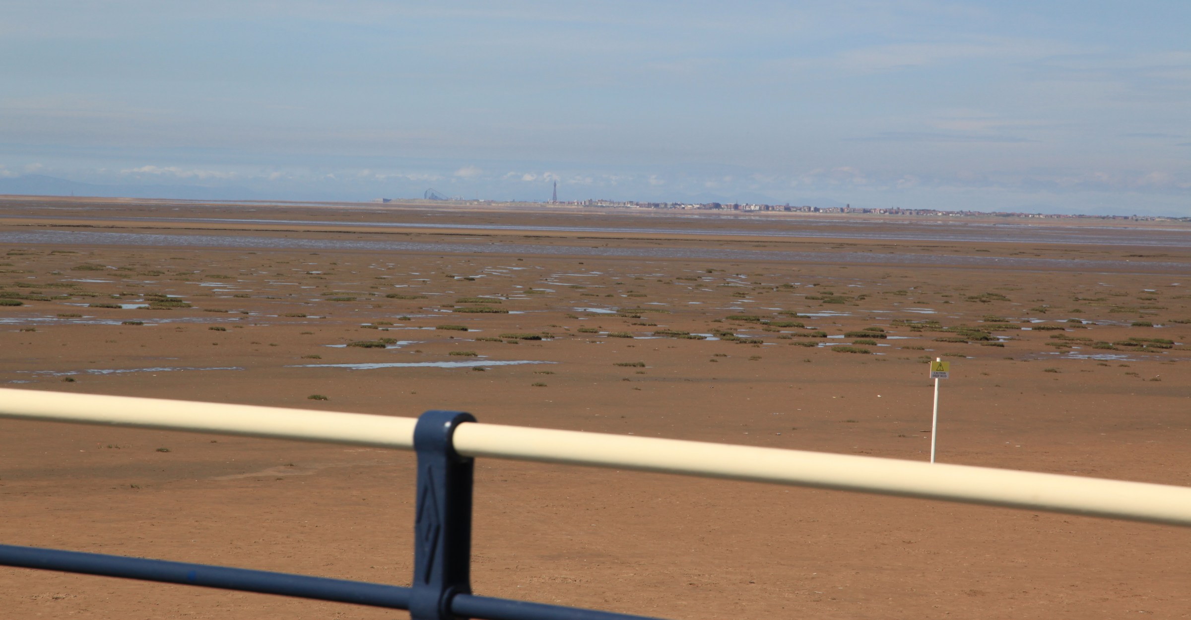 Lytham St Annes centre and right, with Blackpool centre left and continuing round the coast behind Lytham St Annes, seen from the end of Southport Pier.