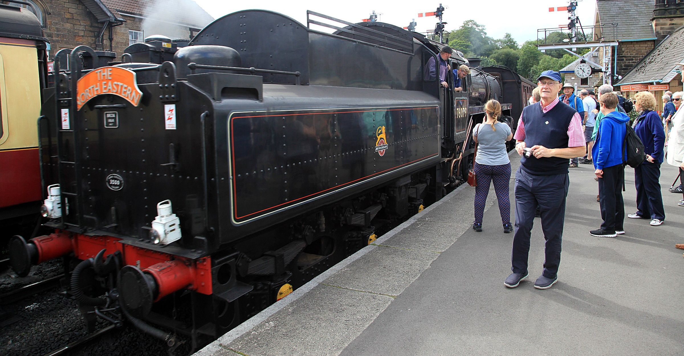 50.  Arriving from the Pickering direction is our train, which will take us to Whitby, with the engine running backwards (or to use the correct terminology, "tender first").