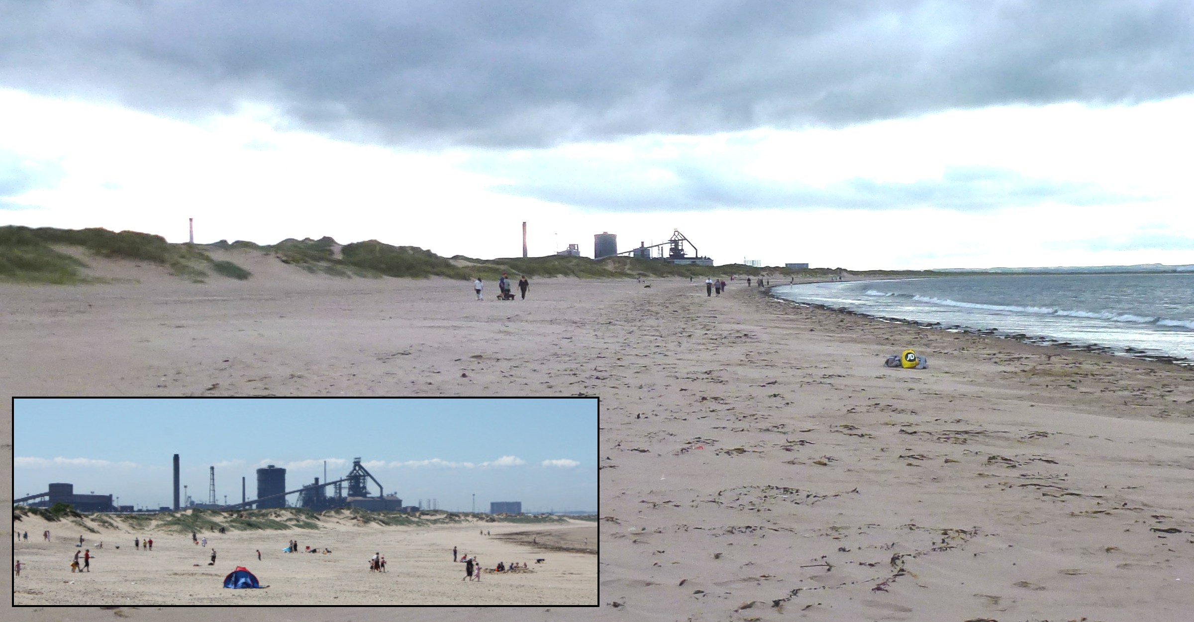 The view northwards along Redcar beach.  The Steel Works' silhouette is getting smaller (see 2011 inset) as it is currently being demolished. I will miss it when it's gone, as, perversely, I find this a rather artistic scene!