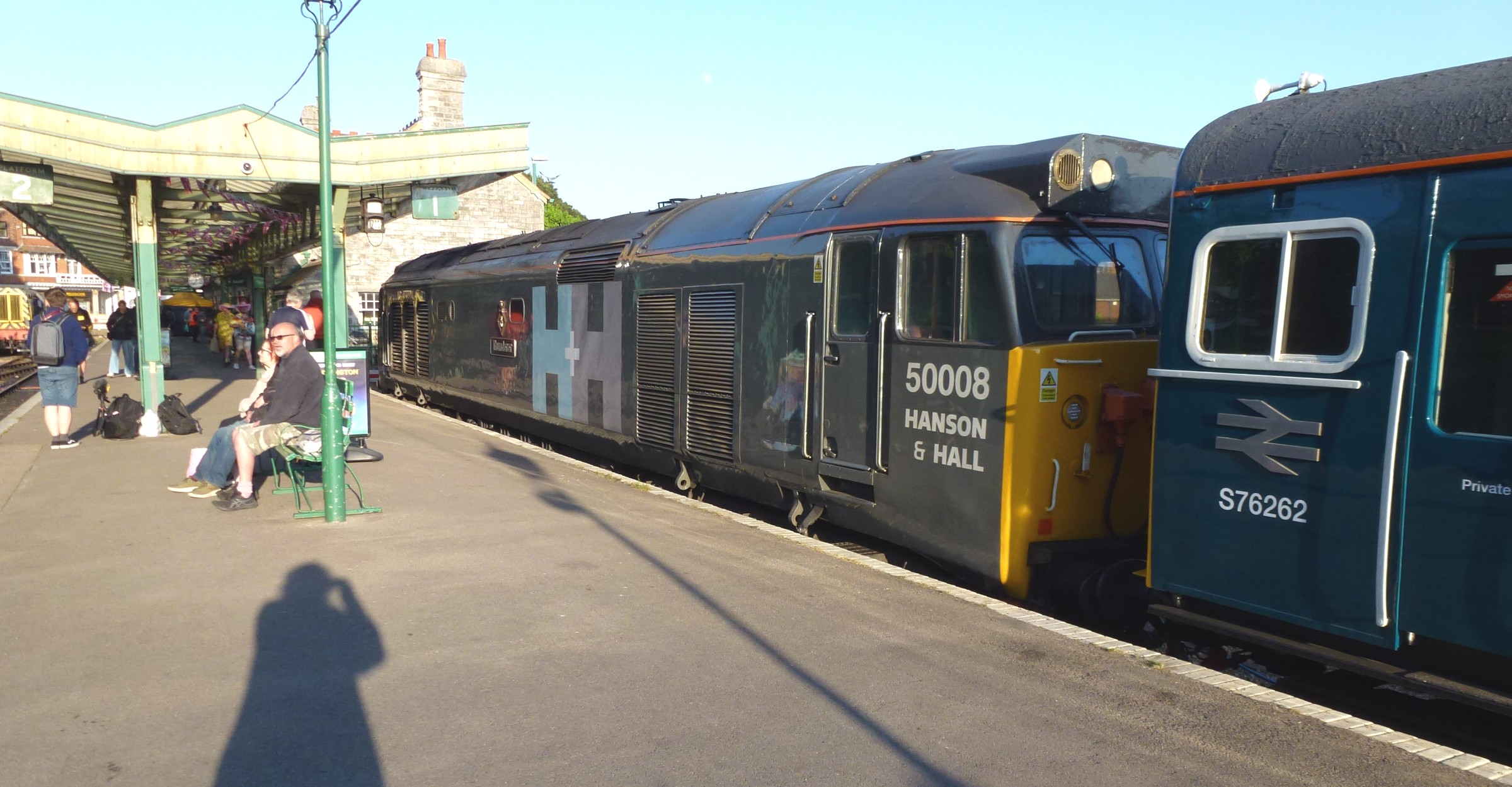 Our first weekend in Swanage coincided with the Swanage Railway's Diesel Gala Weekend, hence the variety of locos you will see here. Class 50 50008, originally D408, was built by English Electric Vulcan Foundry in 1968. Withdrawn and sold for preservation in 1992, now owned and operated by Hanson & Hall Rail. Seen at Swanage. |