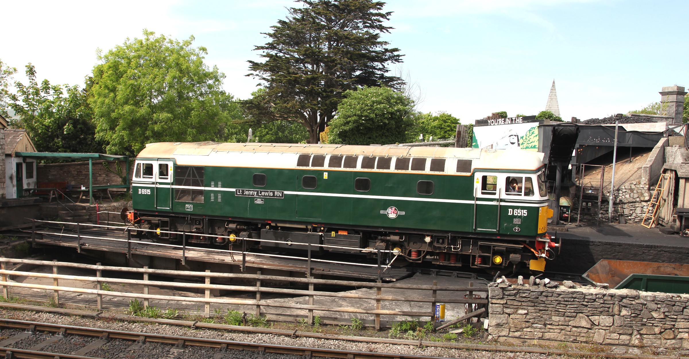 Class 33 D6515 "Lt Jenny Lewis RN" in the depot yard at Swanage. It was named in 2014 in honour of a Swanage Railway enthusiast from Dorset, killed at the age of 25 in a Royal Navy helicopter crash in 2002.