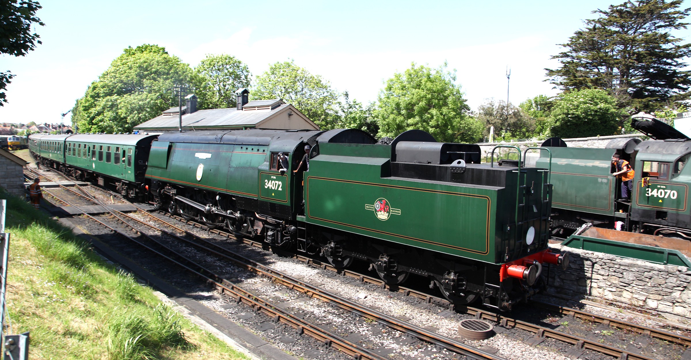 Another of the Battle of Britain Class, 34072 "257 Squadron", approaches with a train. Built at Brighton Works in 1948, it was one of the first of this batch produced under BR ownership, so was not allocated a Southern Railway (21C---) number and carried its BR number from the start. Withdrawn in 1964.