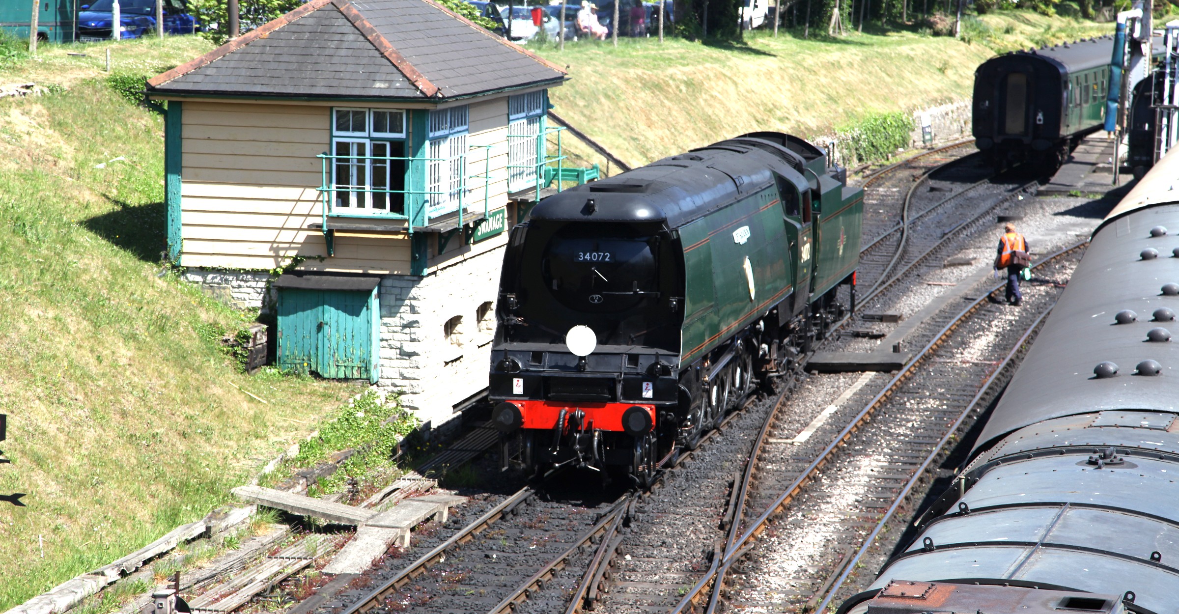 With the Diesel Gala over the trains are back to normal length and the loop can be used again. "257 Squadron" has just come from the far end of the train it brought in, run round the loop and is about to be attached to the other end for the next journey. |