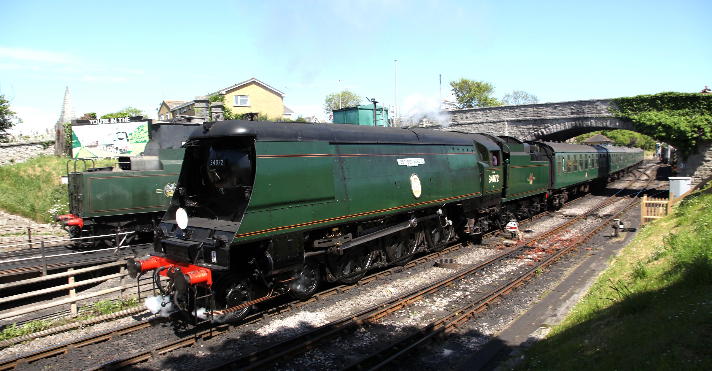"257 Squadron" leaves with the train, passing sister "Manston" at the shed.